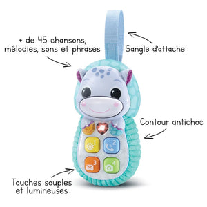 Avec son Allô Bébé Toudoux Vtech-bleu, votre tout-petit s’amuse à imiter les grands et découvre des phrases, chansons et sons amusants avec la douce compagnie de Théo, son nouvel ami l’hippo.
