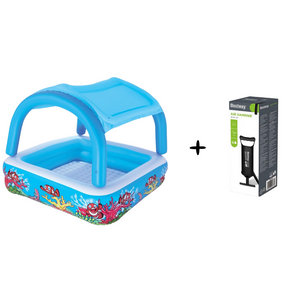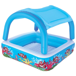 Laissez vos enfants s’amuser dans cette piscine de la marque Bestway ! Cette piscine peut être rapidement gonflée et dégonflée. Grâce à son revêtement en vinyle et au plancher rembourré de haute qualité, cette piscine gonflable est solide et durable. Un auvent amovible avec des éléments de fixation faciles à utiliser est inclus pour protéger les enfants contre les rayons du soleil. Profitez de l'eau fraîche et amusez-vous dans votre propre arrière-cour dans cette piscine gonflable. Le bouchon de vidange facile à utiliser permet le drainage de l'eau. Veuillez noter : cette piscine est adéquate aux enfants de 3 ans et plus.