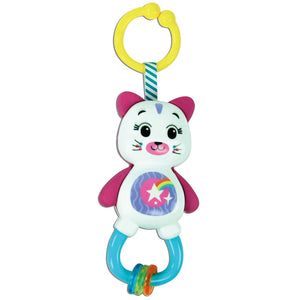 Un hochet coloré en forme de chat mignon, rempli d'éléments en caoutchouc doux et sûrs et d'un anneau pratique pour l'accrocher.
