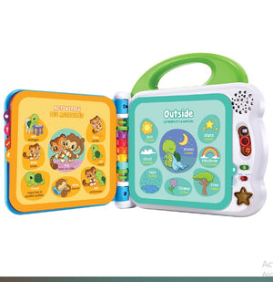 Cet imagier bilingue comporte 12 pages éducatives plastifiées et illustrées avec capteurs sensitifs pour toucher les illustrations et faire de nombreuses découvertes. En touchant le livre, l'enfant déclenche des mots / phrase / sons en français et anglais.