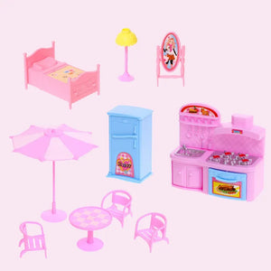 La maison comprend des meubles uniques, notamment une table avec chaises, un parasol, un frigidaire, une petite cuisine, un lit et un miroir faciles à déplacer.
