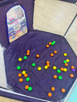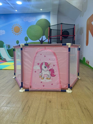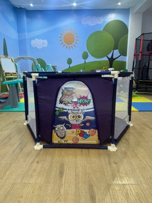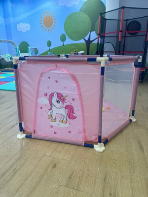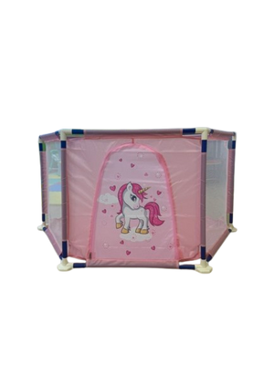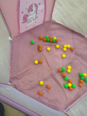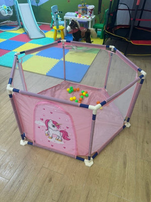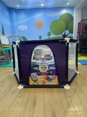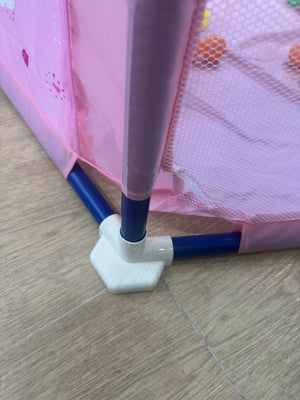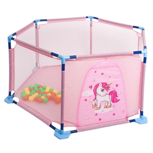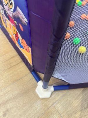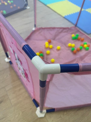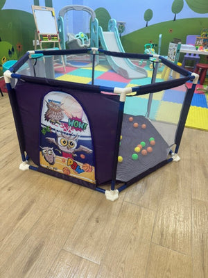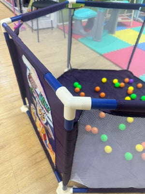 Cinq murs du parc sont en grillage, ce qui permet de surveiller l'enfant pendant qu'il joue. Un mur est doté d'une fermeture éclair pour une entrée et une sortie faciles. Le parc est livré avec 40 balles colorées.