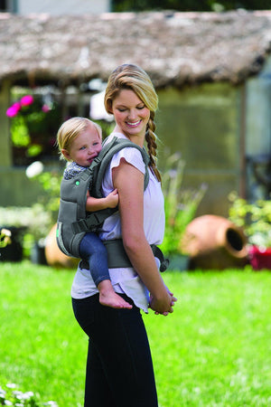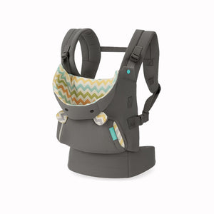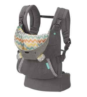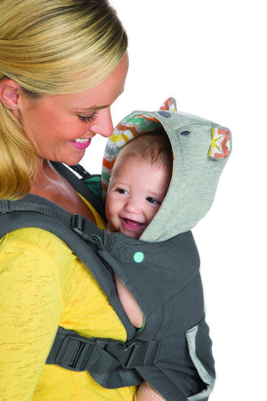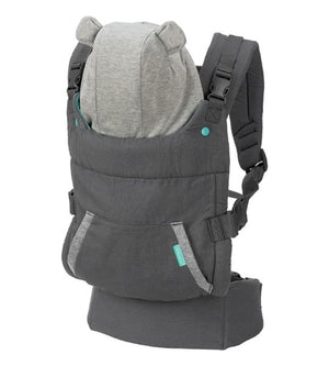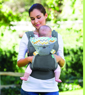 Le porte bébé ergonomique de la marque infantino comprend un capuchon à auvent cintré unique qui garde bébé à la vue et au beau couvert.