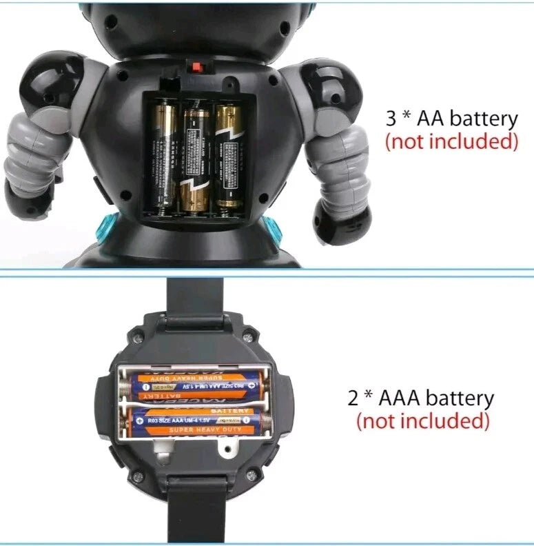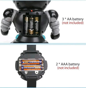 Préparez-vous à du cyber-amusement avec un robot contrôlé par une montre connectée. Robot incroyable avec montre intelligente. Vous pouvez le gérer depuis votre montre ! Vous pouvez surprendre vos amis en le contrôlant depuis votre propre montre numérique avec un design noir et bleu clair cool. Il dispose d'une fonction d'action programmable multidirectionnelle ainsi que de lumières et de sons.