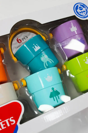 Le lot se compose de 6 petits seaux colorés avec des designs rigolo qui favorise la motricité fine ainsi que la coordination œil-main.