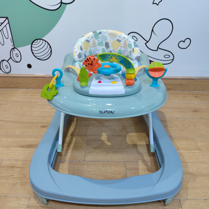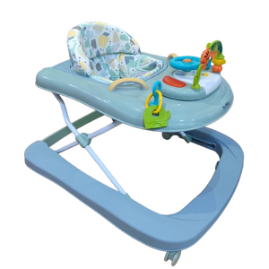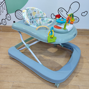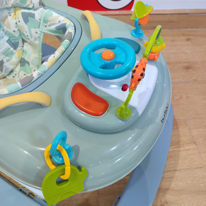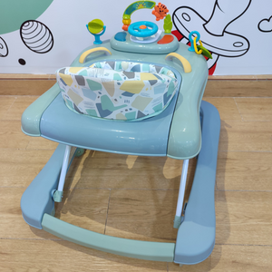 Ce trotteur pour bébé au design doux en vert pastel est parfait pour accompagner les premiers pas de votre enfant tout en stimulant son imagination. Doté d'un siège rembourré avec un motif coloré, il offre confort et sécurité. Le plateau de jeu est équipé de jouets interactifs colorés, incluant un volant et des éléments à manipuler, pour favoriser le développement sensoriel et la coordination.