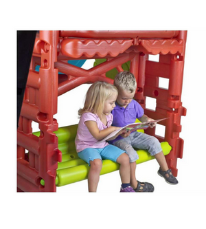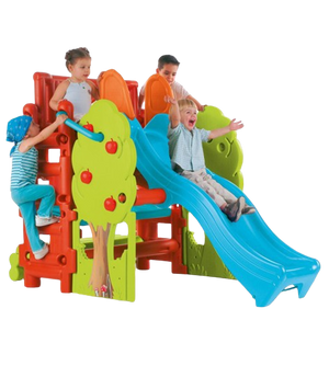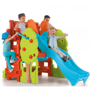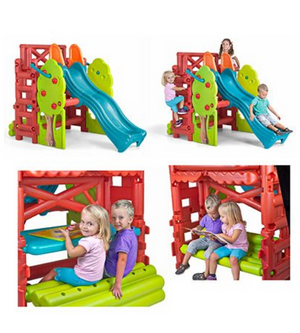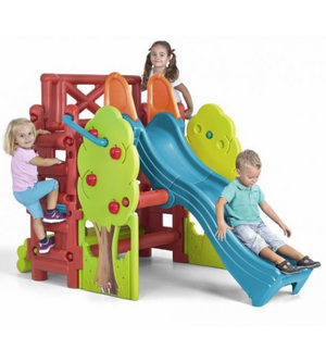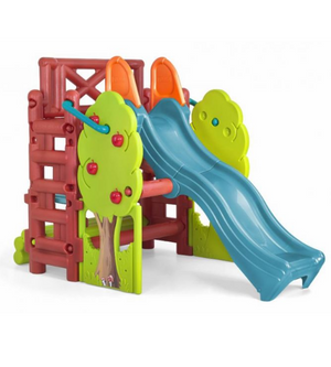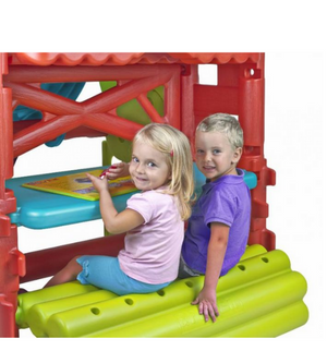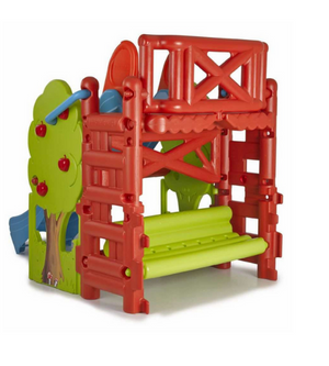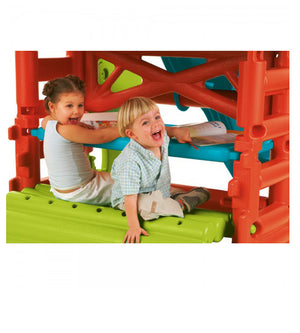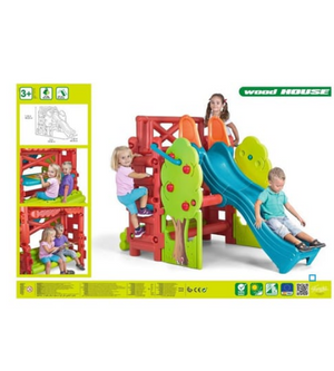 La cabane dans les arbres avec toboggan et deux échelles latérales, avec un banc transformable en bac à sable. Facile à assembler, durable et sûr, dans des couleurs vives et résistant à la lumière du soleil et aux variations de température.